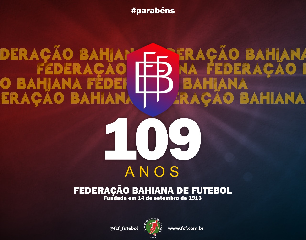 A Federação Bahiana de Futebol completa nesta quarta-feira (14/09) 109 anos de fundação. O presidente da Federação Catarinense de Futebol (FCF), Rubens Angelotti, cumprimenta e parabeniza a entidade, em nome de seu presidente, Ricardo Lima, e deseja sucesso na sequência de trabalho.