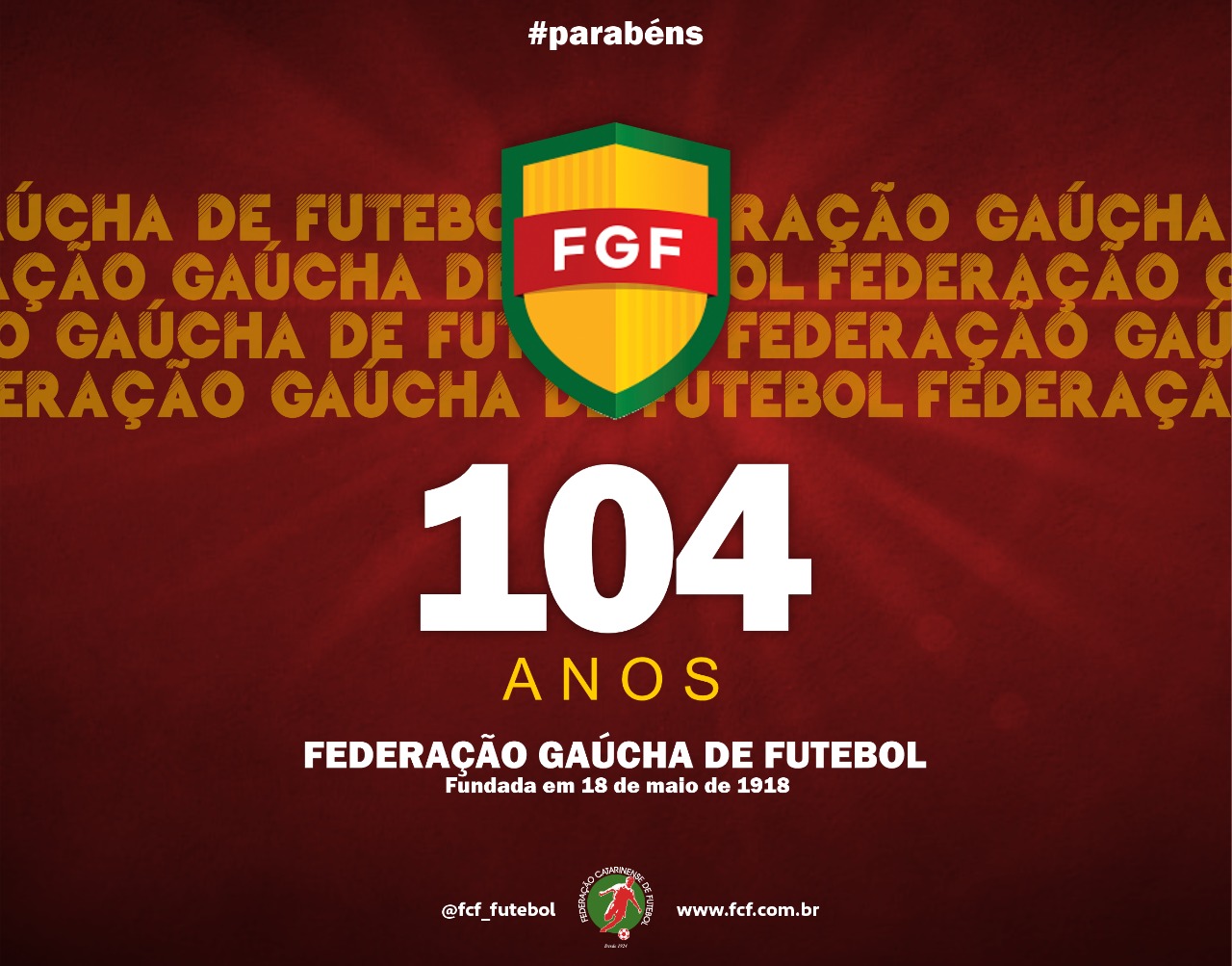 A Federação Gaúcha de Futebol (FGF) comemora nesta quarta-feira (18/05) 104 anos de fundação. O presidente da Federação Catarinense de Futebol, em nome do seu presidente, Rubens Angelotti, e diretoria, parabenizam a entidade assim como o seu presidente, Luciano Dahmer Hocsman, e deseja sucesso.