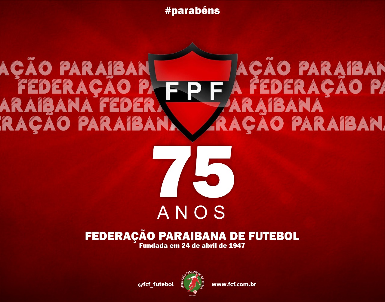 A Federação Paraibana de Futebol completa neste domingo (24/04) 75 anos de fundação. A Federação Catarinense de Futebol (FCF), em nome de seu presidente Rubens Angelotti e diretoria, parabenizam a Federação Paraibana de Futebol e sua presidente, Michelle Ramalho, pela data e deseja sucesso.