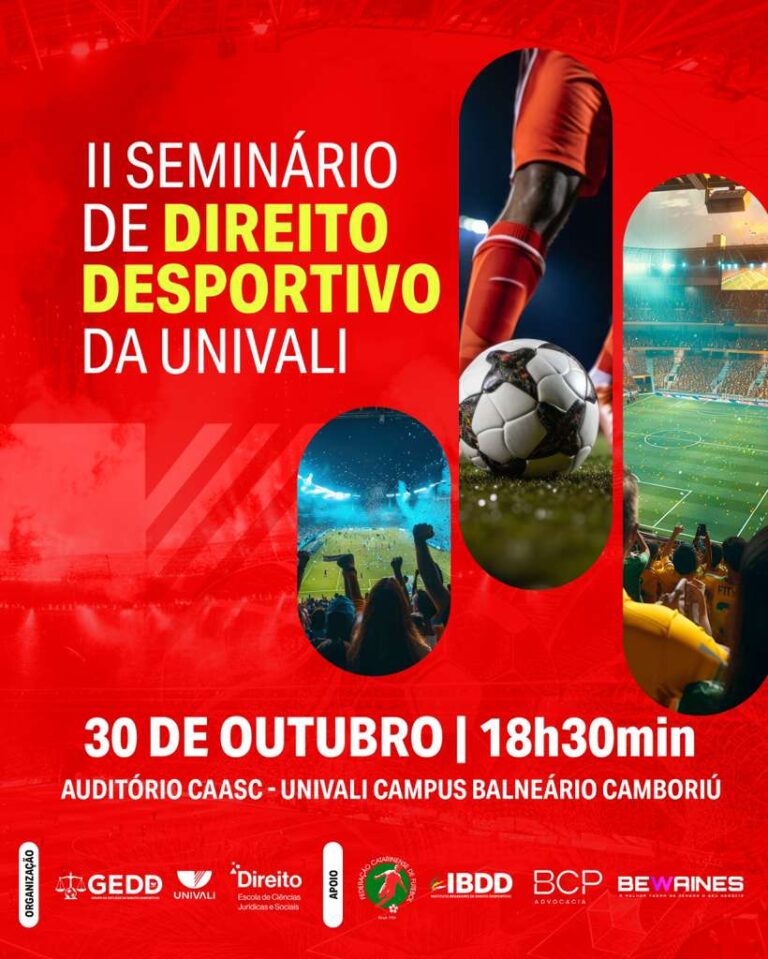 A segunda edição do Seminário de Direito Desportivo será realizado nesta quinta-feira (30/10), a partir das 18h30min, no Auditório da Caixa de Assistência dos Advogados de Santa Catarina, na Universidade do Vale do Itajaí (Univali), Balneário Camboriú. Profissionais renomados participaram do evento. O evento conta com apoio da Federação Catarinense de Futebol (FCF).