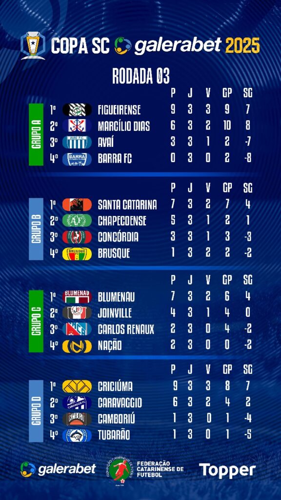 Grandes jogos marcaram a terceira rodada da Copa Santa Catarina Galerabet 2025. Ao todo foram realizadas oito partidas e com boas disputas nas quatro chaves. O último jogo da rodada ocorreu na noite desta quarta-feira (24/09). No estádio Domingos Machado de Lima, o Concórdia venceu o Brusque pelo placar de 2 a 1.